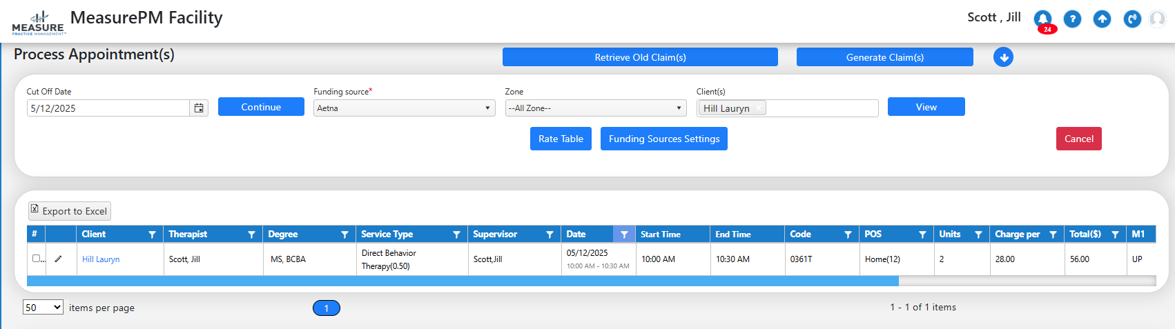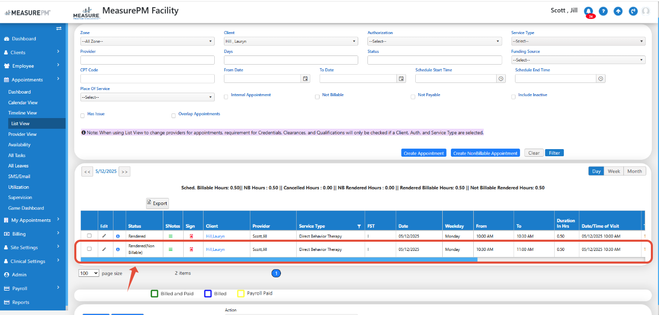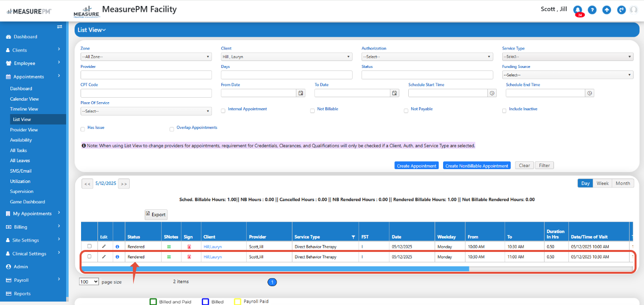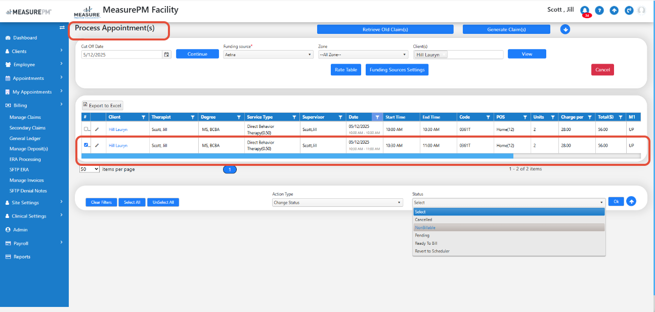 Example in Process Appointments: There are two sessions scheduled for this client on 5/12/25 — one billable and one non-billable. However, only the billable session will appear within Process Appointments (also known as Stage 1 Billing)