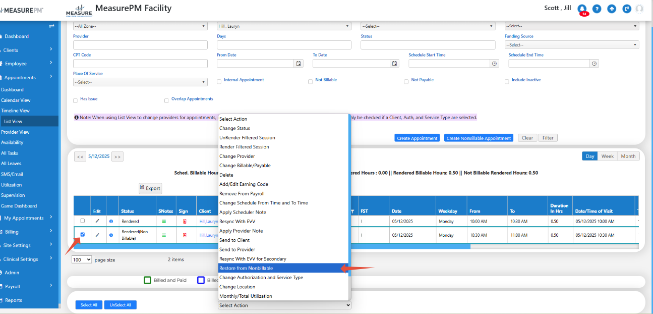 We’ve introduced a “Restore from Nonbillable” action to the Appointments List View. This action allows users to recover sessions previously marked as non-billable, whether by accident or administrative choice, and return them to a billable status.