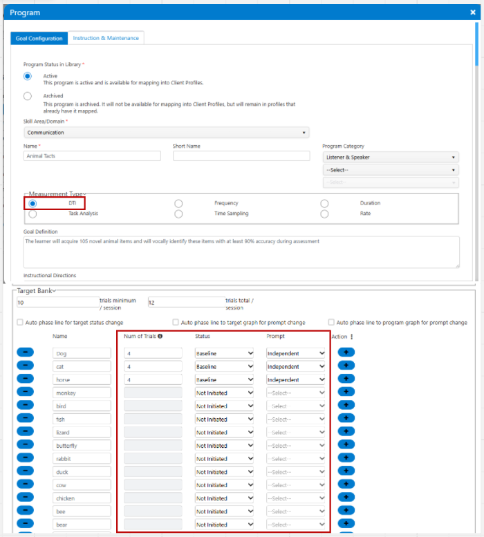 When you map (i.e., add) a DTI based program to a Client Clinical Profile, or you are changing an existing program Measurement Type to be DTI, the same configurable options will be available as in the Program Library. If you would like the target to be available for data collection, you will need to simply set the status to an active status, assign a prompt, and assign a number of trials.