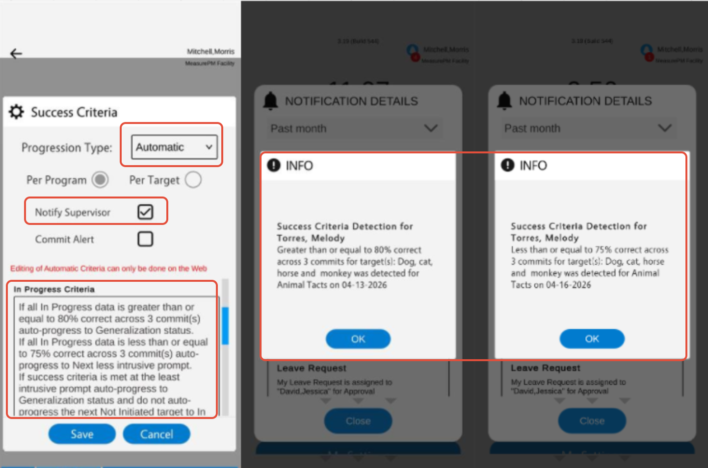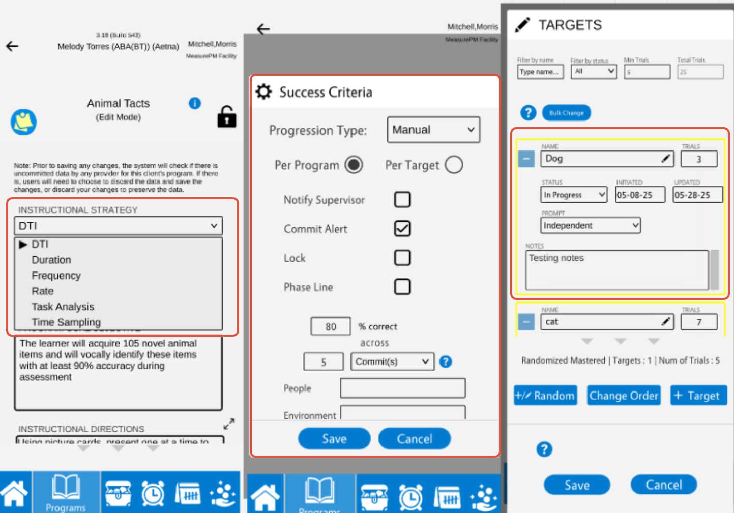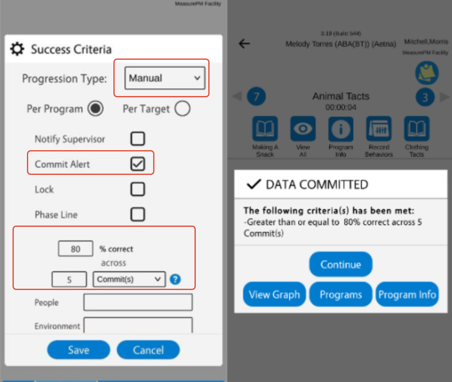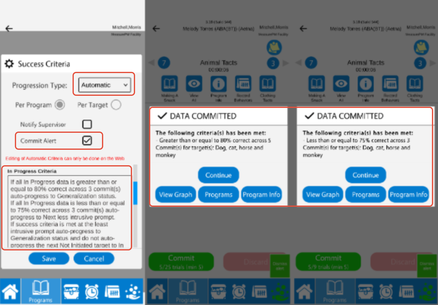 You can configure manual success criteria on both the Web and Mobile-App, and you can configure automatic criteria across Web only. When configuring success criteria for a DTI program you will be entering what percentage correct needs to be achieved for mastery criteria to be met (applicable for manual and automatic progression), and/or entering a percentage correct to trigger revisions criteria (applicable for auto progression only).