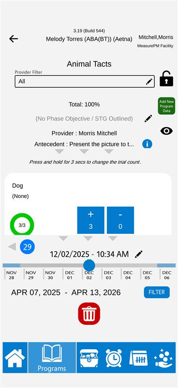On the Web, the Trial by Trial report can be viewed under Reports >Data Reports >Clinical >Trial by Trial. In this report, committed DTI data is displayed within the “Trial by Trial” column. Each individual trial is listed in the order in which it was recorded. The data shows the target name (for ex: Dog, Cat, Horse, Monkey), the target status ( “In Progress”) and the data recording type used ( “+”, "-", etc.). This allows you to view every trial recorded during the session, in addition to the total trials and percentage correct. This report also shows the Program Name, Program Measurement Type, and the Appointment Date.